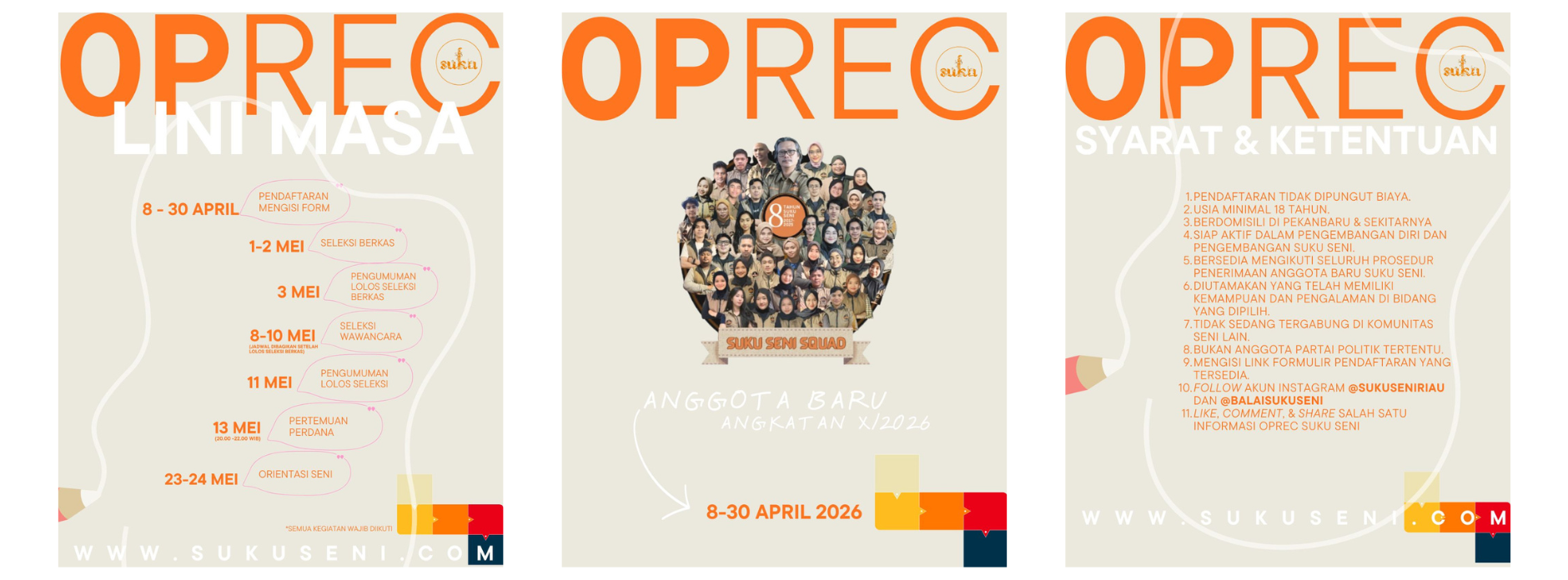 Memasuki tahun ke sepuluh sejak berdirinya Suku Seni Riau pada tahun 2017. Kini, Suku Seni Riau kembali membuka rekrutmen anggota baru untuk angkatan X. Dan tahun 2026 ini, Suku Seni sudah memulai membuka pendaftaran mulai dari tanggal 8 hingga 30 April mendatang. Terdapat 12 bidang yang ada di Suku Seni Riau dan bisa dipilih lebih dari satu, diantaranya ialah tari, teater, musik, film, seni rupa, sastra, jurnalistik, desain grafis, marketing, videografi, ekonomi kreatif, serta arsip dan perpustakaan.
